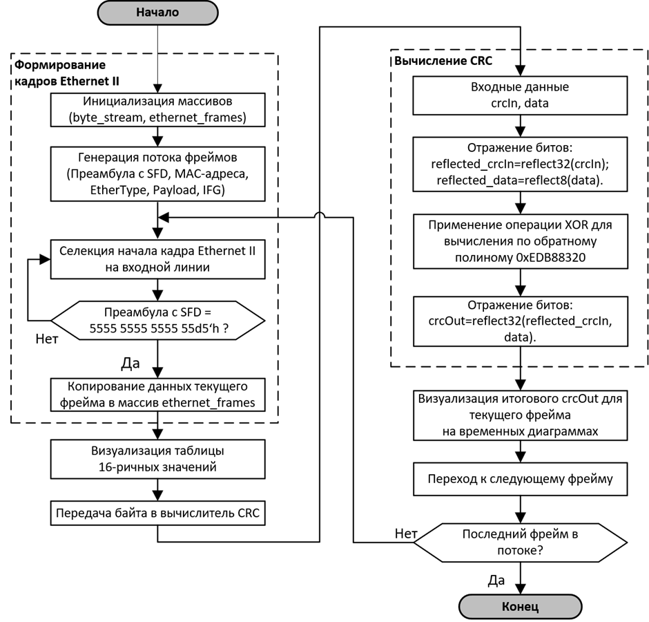 Формирователь кадров Ethernet II в массивах byte_stream, ethernet_frames генерирует поток фреймов, содержащих преамбулу SYNC с последним байтом SFD, MAC-адреса, поля EtherType, Payload и межкадровый интервал IFG. По сигналу от селектора начала кадра Ethernet II данные потока побайтно (data) передаются в вычислитель CRC через регистр. Вычислитель CRC по полиному 0x04C11DB7, используя функции отражения битов на входе и выходе, реализует вычисление обратного полинома 0xEDB88320 от data на основе функций XOR. Генерируемые фреймы визуализируются в виде таблицы 16-ричных значений, а байты данных data и результирующие значения CRCout визуализируются в виде временных диаграмм в среде моделирования. Алгоритм моделирования CRC-кодера, представленный на рис. 3, включает операции по формированию кадров Ethernet II, вычислению CRC и визуализации этих процессов. После инициализации массивов byte_stream и ethernet_frames с их использованием генерируется поток кадров. Формируемый поток кадров Ethernet II состоит из случайного количества фреймов (от 10 до 35), причем каждый фрейм содержит преамбулу (7 байт 0x55) с SFD (1 байт 0xD5), случайные MAC-адреса (12 байт), случайный EtherType (2 байта, IPv4, ARP или IPv6), случайную Payload (от 46 до 1 500 байт) и межкадровые интервалы IFG (от 12 до 24 байт нулей). Перед передачей байта в вычислитель CRC согласно алгоритму моделирования осуществляется селекция начала кадра Ethernet II путем поиска преамбулы с SFD в потоке на входной линии. Затем выполняется копирование данных текущего фрейма в массив ethernet_frames без преамбулы с SFD, которые визуализируются в виде таблицы 16-ричных значений.