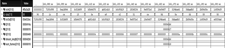 Fig. 4. Simulation results: time diagrams of the CRC32 encoder (a);