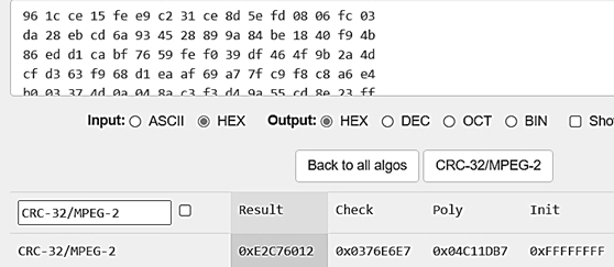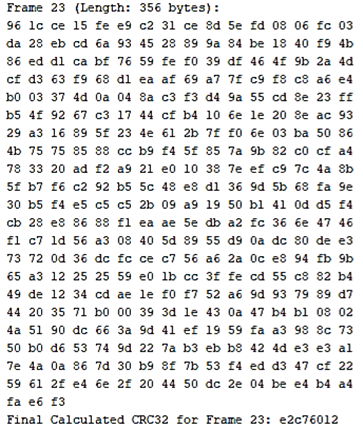 Так, при использовании CRC с полиномом 0x04C11DB7 при начальном регистре 32'hFFFFFFFF для одного из сгенерированных фреймов, содержащего случайные данные, был получен хеш 0xE2C76012, что подтверждается проверкой в онлайн-калькуляторе CRC.