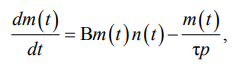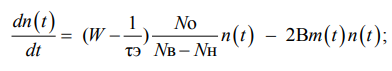 где системные переменные: n(t) – приведенная населенность верхнего уровня лазерного перехода; m(t) – приведенное число фотонов; t – время; параметры: W – скорость накачки; τэ – эффективное время жизни возбужденного состояния АС; Nо = Nв + Nн – общая населенность лазерного перехода: Nв ‒ верхнего уровня, Nн – нижнего уровня; B – эйнштейновский коэффициент; Bm(t) – скорость индуцированных переходов; τр – время жизни фотона в резонаторе, τр = 2L / (Cα), где L, C, α – длина резонатора, скорость света, потери излучения соответственно.