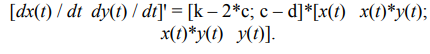 [Lorenz]=@(t, x) [k*x(1) – 2c*x(1)*x(2); c*x(1)* – d*x(2)];