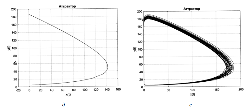 а, б, д, е, – аттракторы; в, г – временные характеристики