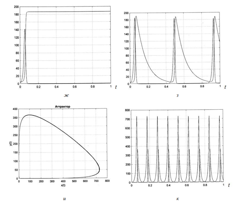 в зависимости от значений параметра управления «d»: 1 (ж), 10 (з), 100 (и, к); и – аттракторы;