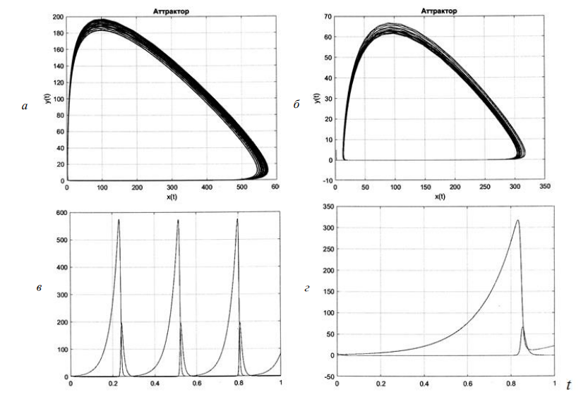 а, b – attractors; в, г – time characteristics (by ordinate axis placed variable x(t), y(t) in relative units)