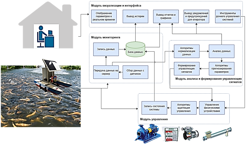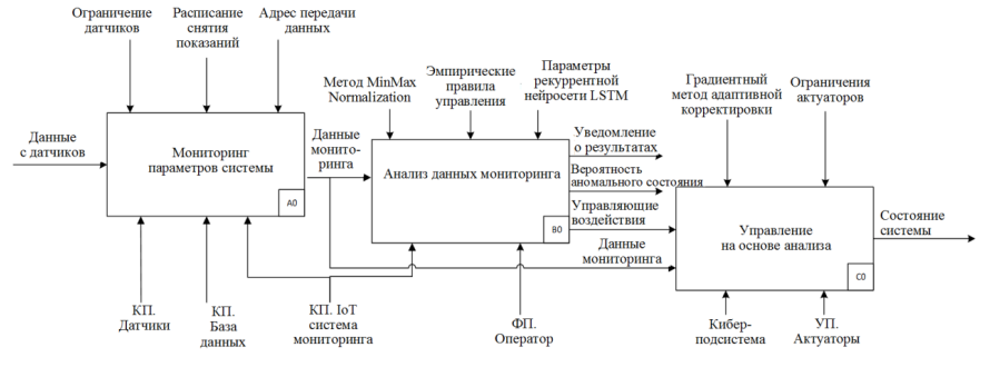 Статья посвящена разработке и обоснованию метода анализа данных мониторинга, ориентированного на формирование управляющих воздействий в составе киберфизических систем, обусловленное необходи-мостью повышения эффективности автоматизированных систем управления за счет внедрения интеллектуальных методов обработки информации, которые обеспечивают адаптацию к изменяющимся условиям открытой внешней среды. Предлагаемый метод базируется на последовательном выполнении трех этапов: нормализации поступающих данных, прогнозировании параметров системы с использованием архитектуры рекуррентной нейронной сети LSTM и адаптации управляющих воздействий с помощью градиентного метода. В качестве примера применения разработанного метода рассмотрена система мониторинга параметров водной среды в рыбном хозяйстве, где осуществлялся сбор показателей температуры воды, уровня pH и содержания растворенного кислорода. Полученные экспериментальные данные позволили провести обучение модели и реализовать механизм автоматической корректировки управляющих параметров в режиме, приближенном к реальному времени. Оценка качества прогнозирования осуществлялась с использованием метрик MAE и MAPE, значения которых составили менее 0,2 %, что указывает на высокую точность модели. Разработка включает также модуль эмпири-ческих правил управления, реализующих логическую интерпретацию возможных отклонений и формирование соответствующих управляющих сигналов. Проведенные натурные испытания на предприятиях прудового хозяйства подтвердили эффективность предложенного подхода: зафиксировано повышение точности управления до 86 %, снижение потребления ресурсов на 9 % и сокращение времени, затрачиваемого на мониторинг, до 95 %. Разработанный метод может быть масштабирован и адаптирован для использования в других областях: промышленной автоматизации, экологическом мониторинге, интеллектуальных транспортных системах, а также в инфраструктуре «умных» городов, что подтверждает его универсальность и научную новизну.