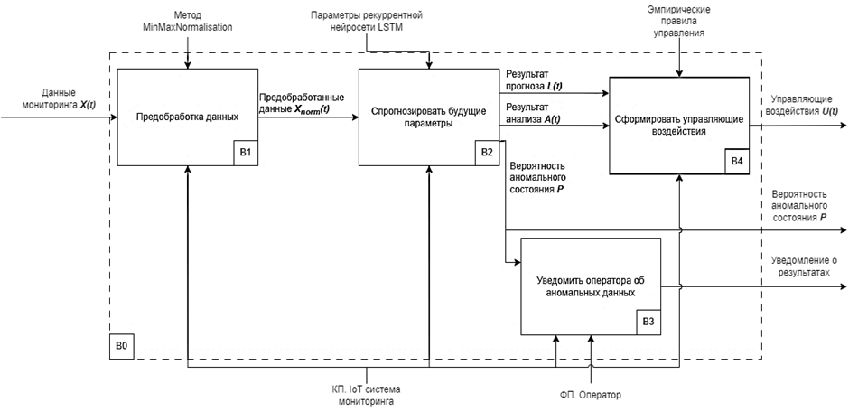Анализ данных мониторинга (рис. 3): нормализация данных, применение архитектуры LSTM для предсказания будущих состояний системы на основе временных рядов, обратная нормализация, уведомление оператора, а также формирование управляющих воздействий.