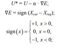 где U* – новые параметры управляющего воздействия; α – скорость обучения; ∇E – знак градиента ошибки; k – коэффициент чувствительности (определяется эмпирически); σi – стандартное отклонение данных в этих же единицах; ε – малое число для предотвращения деления на ноль.