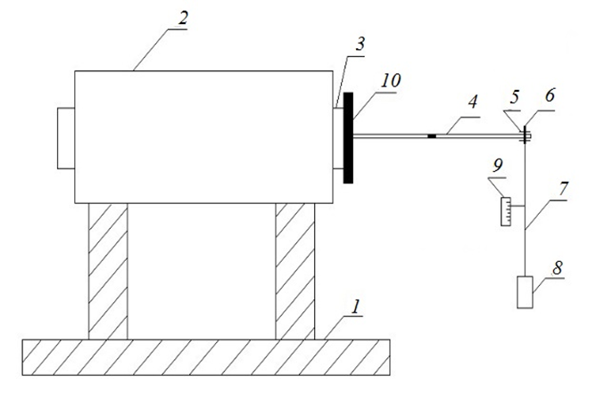 To investigate the effect of defects in the weld joint of the resulting specimens, a device for testing specimens for fatigue was developed [13]. Figure 5 presents the schematic diagram of the installation. The installation consists of a base 1, on which a drive unit 2 is mounted, with a rigidly fixed grip 3 attached to it for cantilever mounting of the specimen 4. At the free end of the specimen 4, a cage 5 with radial bearings is installed, secured with metallic fasteners 6. Perpendicular to the axis of the grip, there is an additional calibrated spring 7, one end of which is connected to the fastener 6, while the other end supports a load 8. On the calibrated spring, a cargo position sensor 9 is rigidly mounted, and on the grip, a rotation counter 10 is installed and securely fixed.