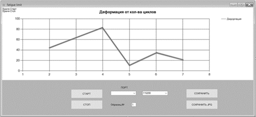 The program is used to calculate the number of oscillations and measure the corresponding deflection of welded joints by counting pulses from the sensor and receiving values from the analog-to-digital converter integrated into the controller, to which a resistive position sensor is connected. Additionally, the program constructs a graph on the computer showing the dependence of sample deformation on the number of cycles based on the received data from the controller. Together, the fatigue testing installation and the computer program will enable determining the endurance characteristics of the samples.