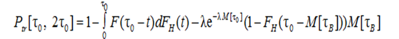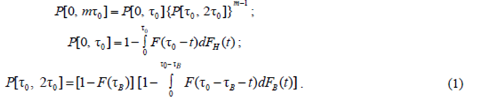 The probability P[τ0, 2τ0] is a function of τВ = С, the recovery time of the self-monitoring subsystem. For convenience, when studying the dependence of Р[τ0, 2τ0] on М[τВ], Р[τ0, 2τ0] will be denoted by Р(М[τВ]) or simply Р(τВ). In the case where the distribution law of the protectionrecovery time FB(t) is non-degenerate, the probability of an accident-free watch with self-monitoring for the time from τ1 to τ2, where the times τ1 and τ2 are counted from the start of the watch, is denoted by Р[τ1 to τ2].