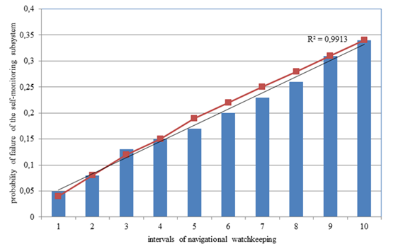 The calculated coefficient of determination (0.99) indicates a very high degree of data conformity with the model, i.e., the model explains their variation almost perfectly. Thus, the exponential distribution model of the self-monitoring subsystem's recovery time can be used for an a priori analysis of the reliability of watchkeeping, which is important for voyage planning and ensuring navigational safety.