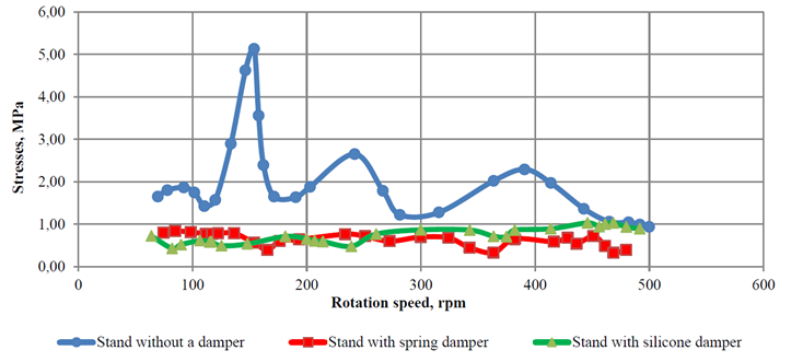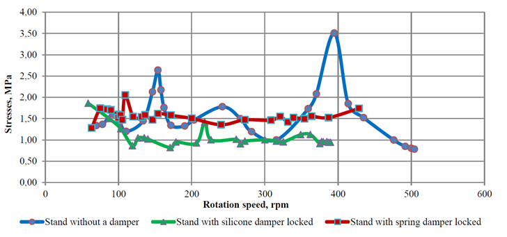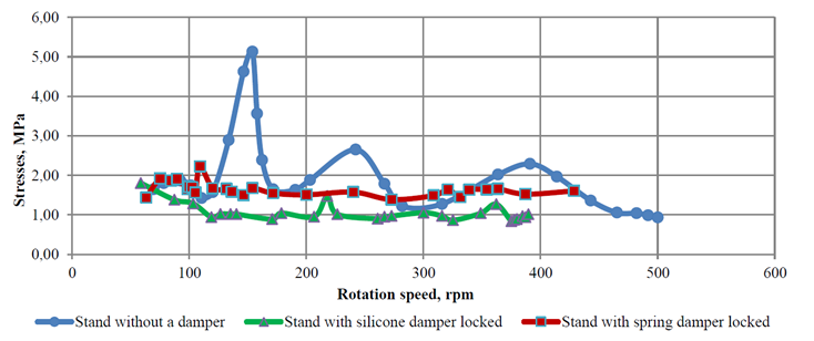 As can be seen from Fig. 5, both dampers effectively reduce the level of both resonant and non-resonant stresses and equalize the voltage dependence on the rotation frequency. At the same time, in the range of rotation speeds up to 250 min–1, the SD is more effective, with a further increase in rotation speed, the PD prototype is more effective. This, in particular, may confirm the effectiveness of the PD installation on modern marine high-speed engines.