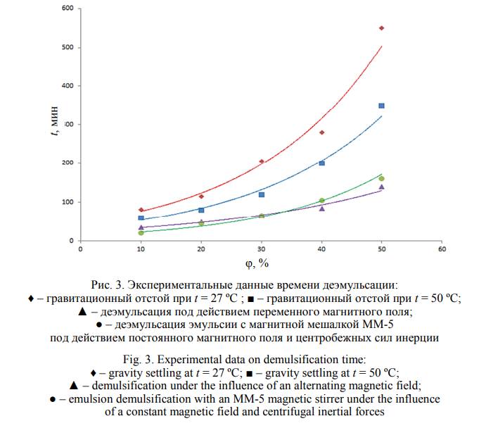 На рис. 3 представлены графики экспериментальных данных времени деэмульсации от обводненности эмульсии φ: гравитационное разделение НВЭ при температуре 27 °С; гравитационное разделение эмульсии при температуре 50 °С; деэмульсация в лабораторной установке под действием переменного магнитного поля.