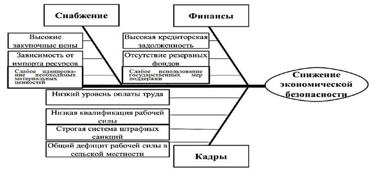 В целях последующей более детальной разработки предложений проанализируем причинно-следственные связи выявленных угроз экономической безопасности ООО «АПК Астраханский» с помощью диаграммы Исикавы (рис. 2).