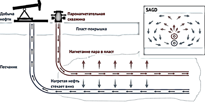 сосно-компрессорные трубы с последующей выдержкой и добычей. Также применялась закачка пара в кольцевое пространство, при которой пар нагнетался к забою по кольцевому пространству, а нефть и конденсат добывались через колонну труб.