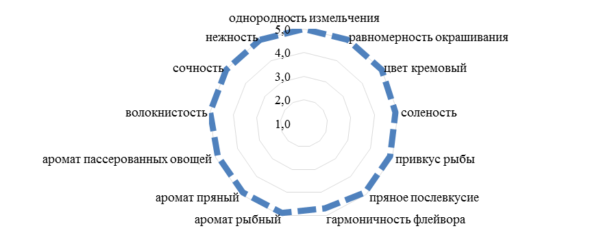 В качестве объекта исследований выступали образцы риетов из голов русского осетра (Acipenser gueldenstaedtii) мороженых, глазированных, выработанных на предприятии ООО «Астраханская рыбоводная компания "Белуга"» (Россия, г. Астрахань), их органолептические характеристики и показатели. Образцы риетов изготовлены на основе прирези мышечной ткани от голов русского осетра. Исследования проводились на базе нормативно подготовленных лабораторных помещений ФГБОУ ВО «Астраханский государственный технический университет» (АГТУ). Рецептуры риетов включают растительное сырье (морковь, томат, свекла, капуста, лук репчатый). С целью улучшения сенсорных свойств использовали пряное ароматическое сырье (лавровый лист, перец черный, СО2-экстракт укропа). Тестируемые образцы риетов на основе головы русского осетра различаются между собой видом овощного наполнителя: образец № 1 – риет с капустой; образец № 2 – риет со свеклой; образец № 3 – риет с морковью и томатом. Образцы были регламентированы и нормативно подготовлены. Оценку органолептических показателей качества продукции нового ассортимента осуществляли с использованием комплекса современных методов, регламентированных ГОСТ 31986-2012, ГОСТ ISO 6658-2016, ГОСТ ISO 8587-2015, ГОСТ ISO 13299-2015, ГОСТ ISO 11036-2017, ГОСТ 33609-2015. Дегустаторов с определенными сенсорными способностями предварительно отбирали из числа сотрудников кафедры «Технология товаров и товароведение» АГТУ и аттестованных в системе «ТПП Эксперт» ТПП РФ экспертов Союза «Астраханская торгово-промышленная палата», обучали по ГОСТ ISO 8586-2015, ГОСТ ISO 6658-2016. Комиссия испытателей включала 20 человек. Сравнительную органолептическую оценку разработанных образцов осуществляли посредством сенсорных профилограмм, графически представленных с использованием дескрипторно-профильного метода дегустационного анализа [11–15]. Для отражения органолептических свойств разработанной продукции идентифицировали и выбирали дескрипторы, опираясь на стандартную терминологию по ГОСТ ISO 5492-2014, с последующим формированием справочника дескрипторов. На основании многостороннего подхода по ГОСТ 33609-2015 интенсивность и степень восприятия дескрипторов ранжировали по пятибалльной шкале от отсутствия восприятия, оцениваемого как «0», до сильного восприятия признака, оцениваемого как «5», с последующим расчетом среднего геометрического значения. Для сопоставления органолептических свойств разработанной продукции использовали комплексную квалиметрическую оценку качества с расчетом средневзвешенных значений относительных показателей и коэффициентов значимости [16]. Потребительские свойства и показатели качества риетов сгруппированы по свойствам, характеризующим безопасность (А), вкусо-ароматические (В(b)) и реологические (C(c)) показатели качества, определяемые по стандартным методикам. Предварительно выбранную номенклатуру органолептических показателей качества использовали для оценки показателей группы В и С. Для отражения уровня качества и рейтинговой оценки рыбной продукции нового ассортимента разработали балльную шкалу и проанализировали недостатки и дефекты, типичные для продукции данного вида. Математико-статистический анализ использовали для оценки экспериментальных данных [17, 18].