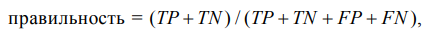 Описание метрик бинарного классификатора. Распространенными метриками бинарного классификатора являются правильность (accuracy), точность (precision), полнота (recall) и F1-мepа [5, 6]. Правильность представляет собой пропорцию верно предсказанных наблюдений: