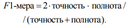 F1-мера – показатель, обеспечивающий некоторый баланс между точностью и полнотой (является средним гармоническим между точностью и полнотой):