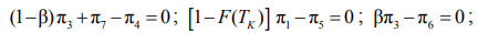 где π1 – вероятность нахождения в работоспособном состоянии; π2 – вероятность нахождения в состоянии отказа; π3 – вероятность нахождения в состоянии поверки отказавшей СТС; π4 – вероятность нахождения в состоянии восстановления (ремонта); π5 – вероятность нахождения в состоянии поверки работоспособной СТС; π6 – вероятность нахождения в состоянии необнаруженного отказа; π7 – вероятность нахождения в состоянии ложного отказа; α – вероятность ложного отказа при поверке; β – вероятность необнаруженного отказа при поверке; F(T) – функция распределения отказов за время T; F(TK) – вероятность отказа на интервале времени между поверками.