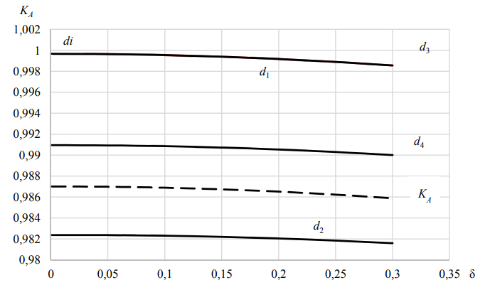 и оптимальное значение относительного допуска δ на ОП (контролируемый параметр), при которых достигается максимальное значение коэффициента готовности KA СТС к применению. На рис. 1 представлены соответствующие графики для коэффициента готовности KA для случая экспоненциального закона распределения отказов с интенсивностью λ = 0,0005.