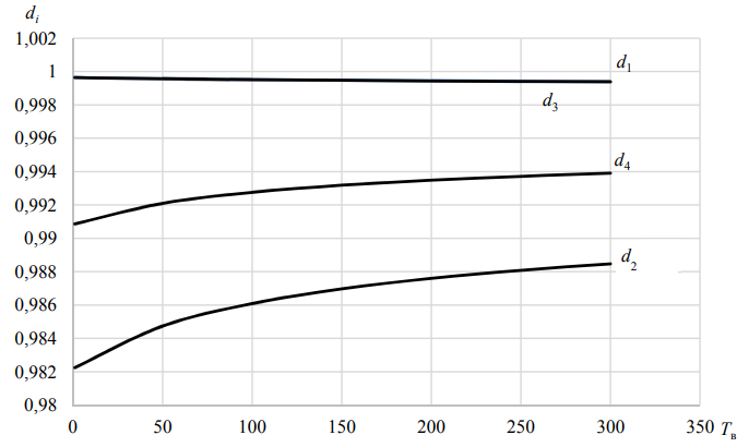 Видно, что показатели достоверности незначительно убывают, а коэффициент готовности достигает максимума при δ = 0,1, который в масштабе графика почти не заметен. Показатели d1 и d3 практически совпадают, поскольку вероятности отказа и необнаруженного отказа – достаточно малые величины. Зависимости показателей достоверности от ИМП приведены на рис. 3.