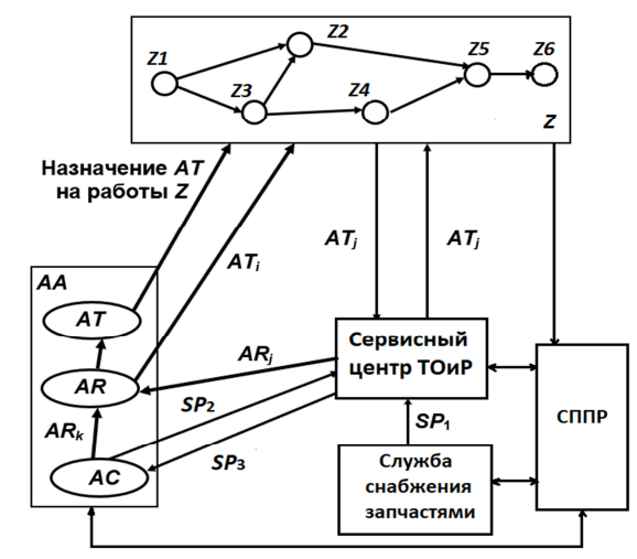 Календарно-сетевой график работ Z определяет последовательность и длительности выполняемых АА операций Z1Z6. Управление процессами обеспечивается с помощью системы поддержки принятия решений (СППР). Во время эксплуатации проводится мониторинг и диагностика технических состояний автомобилей из набора AT. В случае обнаружения у автомобиля ATj неисправности либо при необходимости проведения регламентного или прогнозного технического обслуживания ATj выводится из эксплуатации и направляется в сервисный центр технического обслуживания и ремонта (СЦ ТОиР). При наличии запасных частей для своевременного технического обслуживания автомобиль ATj после ТО возвращается в эксплуатацию для выполнения работ Z. Если же планируемая длительность работ по ТО достаточно большая и остановка выполнения операций Z недопустима, то один из резервных автомобилей ARi получает статус активного (ARiATi) и переводится в эксплуатацию. При этом обслуживаемый автомобиль ATj по завершении ТОиР переводится в резервное состояние (ATjARj).  В статье [13] разработана методика виртуальных испытаний системы АА, основанная на оценке множества сценариев эксплуатации с помощью многофакторного анализа. Однако использованный метод DEA не позволяет учесть влияние вероятностных факторов, связанных с процессами эксплуатации в различных условиях. Предлагается дополнить такое исследование процедурой имитационного моделирования различных сценариев на базе стохастических временных раскрашенных сетей Петри, что обеспечивает задание случайных законов для различных параметров. Множество сценариев анализируется при проведении статистических экспериментов на имитационных моделях с заданием исходных данных как по внешним условиям эксплуатации, так и по техническим и производственным показателям АА.