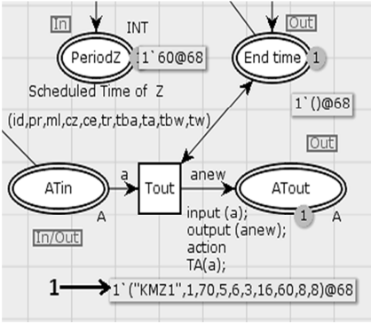 Установлено модельное время: 1 такт = 1 ч. Значение реального времени активной работы автомобиля KMZ1 получено равным ta = 60 ч при плановом сроке также 60 ч (позиция PeriodZ). Автомобиль KMZ1 был отправлен на ТОиР через 8 ч работы (предпоследнее число в маркере). Простой tw на ТОиР составил 8 ч. После этого на 16-м часе KMZ1 продолжил выполнение работы Z до ее полного завершения. Всего на операции Z затрачено 68 ч.
