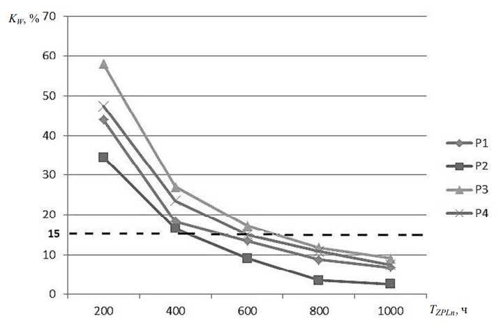 Для примера на рис. 7 показана зависимость коэффициента KW от параметров, заданных в табл. 5. Допустимый уровень коэффициента KW принят равным 15 % и отмечен на рис. 7 пунктирной линией. Анализ показывает, что наименьшее отступление от планового срока обеспечивает набор параметров Р2 (см. табл. 5), начиная с работ со сроком больше 430 ч. По результатам эксперимента на модели получен достаточно большой объем данных, который позволяет оценить эффективность различных сценариев эксплуатации и обслуживания комплекса АА.