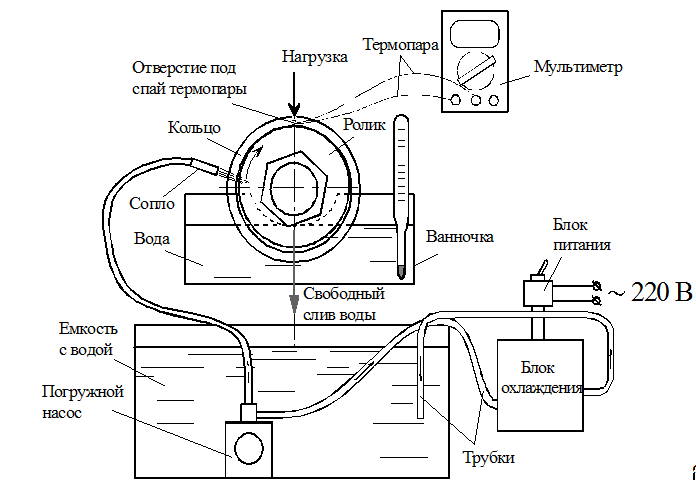 Опыты проводили на модернизированной машине трения – МИ-1 (рис. 1). Сопряжение облицовки гребного вала и дейдвудного подшипника имитировалось парой трения «ролик – кольцо» при частоте вращения ролика n = 200 об/мин. Осуществлялось комбинированное смазывание, реализуемое частичным погружением вращающегося ролика в ванночку с водой в сочетании со струйной подачей мягкой пресной воды в зону трения. Воду подавали по замкнутому контуру погружным насосом из емкости объемом 10 л; часть воды для поддержания ее температуры в диапазоне 20 ± 3 оС пропускали с помощью того же насоса через блок охлаждения.
