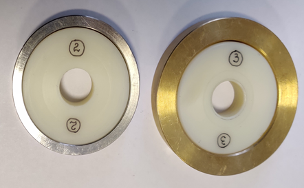 Fig. 2. Photos of reverse (a) and forward (б) friction pairs: on the left in each photo are stainless steel and nylon couplings, on the right – tin bronze and nylon couplings
