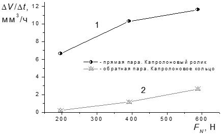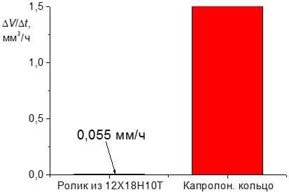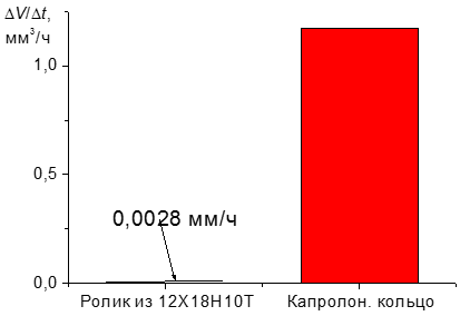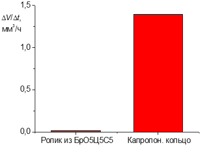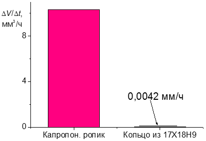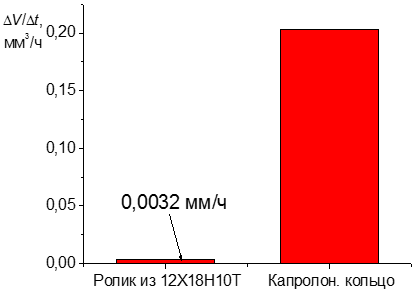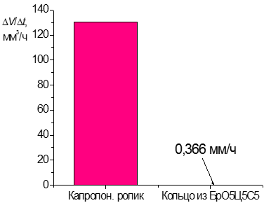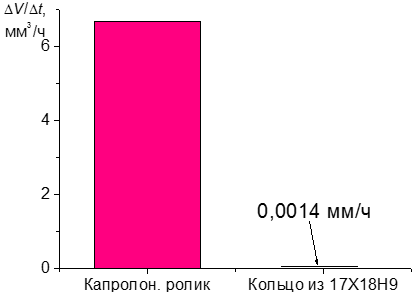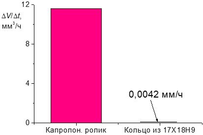 Так же, как и при испытании сопряжения «бронза – капролон», в сопряжении «сталь – капролон» отмечается существенное увеличение скорости изнашивания капролонового элемента при переходе от схемы обратной к схеме прямой пары трения (рис. 9), но порядок увеличения меньше, чем при испытании сопряжения «бронза – капролон».