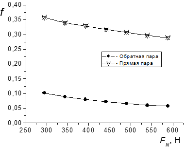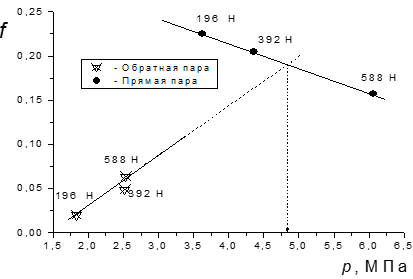 Измерения площади очагов износа на неподвижных элементах прямых и обратных пар трения позволили рассчитать средние давления в зоне контакта. Как видно, зависимости коэффициента трения от давления в контакте разные для прямых и обратных пар трения (рис. 11). Для прямых пар зависимость f(p) убывающая, а для обратных – возрастающая, что указывает на разные причины трения: в обратной паре адгезионная составляющая трения является превалирующей, тогда как в прямой паре существенную роль начинает играть деформационная составляющая. При одной и той же нагрузке на прямую и обратную пару трения у последней в зоне контакта давления почти в три раза ниже, чем в прямой паре трения.