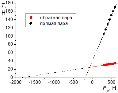 Зависимости T(FN) имеют линейный характер (рис. 5, б), экстраполяция которых до значений силы трения T = 0 позволила получить значения сил адгезии Fa, действующих между поверхностями трения: для обратной пары трения Fa ≈ 1 800 Н, а для прямой Fa ≈ 200 Н.