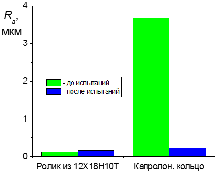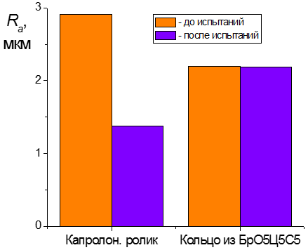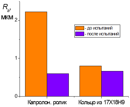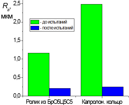 До и после испытаний измеряли шероховатость поверхности трения роликов и колец, а также взвешиванием определяли их износ по потерям массы.