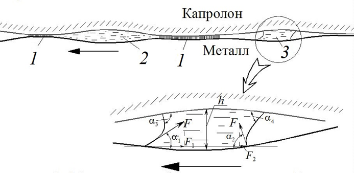Согласно [14, 15], можно предположить существование следующих зон контакта при трении капролона по металлической поверхности в условиях смазывания водой (рис. 7): участков 1 граничного трения, на которых существует граничная пленка, состоящая из адсорбированных молекул воды; участков 2, представляющих собой микрозазоры, полностью заполненные водой, и участков 3 – микрозазоров, заполненных водой частично, при этом из-за гидрофильности поверхностей трения (см. табл. 2) в частично заполненном водой зазоре образуется мениск 3.