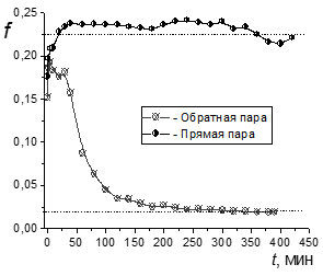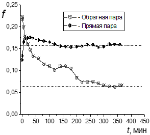 Fig. 3. Dependence of the coefficient of friction of bronze BrO5Ts5S5 on nylon in forward and reverse pairs on the duration of tests at a load of 588 Н