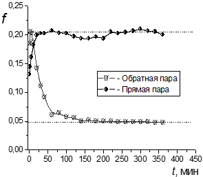 Рис. 3. Зависимость коэффициента трения бронзы БрО5Ц5С5 по капролону в прямых и обратных парах от продолжительности испытаний при нагрузке 588 Н