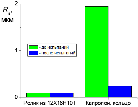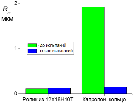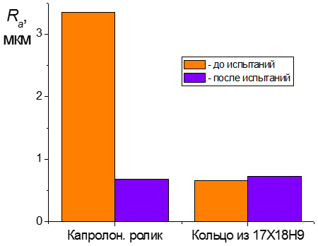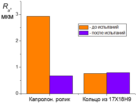 Измерения шероховатости элементов обратной и прямой пар трения до и после испытаний показали ту же тенденцию, что и при испытании сопряжения «бронза – капролон», а именно: высотный параметр шероховатости капролонового элемента (капролонового ролика в прямой паре и капролонового кольца в обратной паре) принимает значение, равное значению параметра шероховатости стального контртела, при этом шероховатость последнего в результате трения не изменяется (рис. 10). По всей видимости, при реализации схемы прямой пары трения на практике необходимо было бы обеспечить как можно меньшую шероховатость поверхности трения стального вкладыша, что технологически значительно сложнее обеспечить по сравнению с обработкой наружной поверхности.