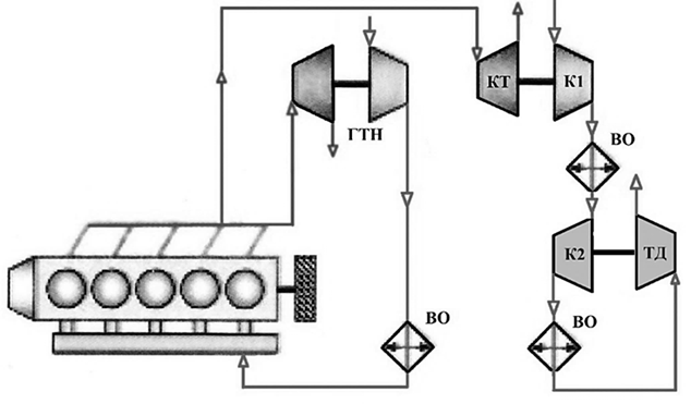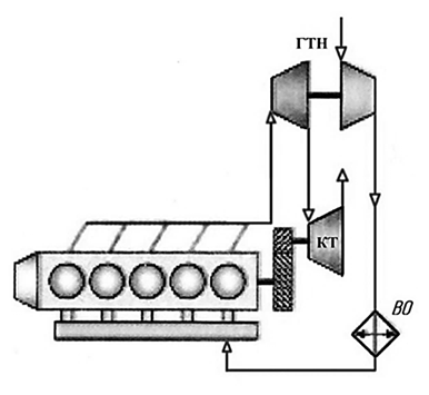Рис. 2. Схема использования газовой компаундной турбины для передачи мощности на коленвал дизеля: ГТН – газотурбонагнетатель; КТ – компаундная турбина; ВО – воздухоохладитель