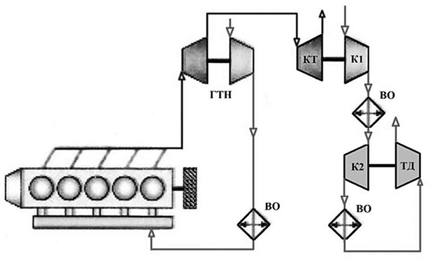 Другим примером может быть турбодетандерная схема утилизации (рис. 5), где газовая компаундная турбина приводит винтовой воздушный компрессор (ВК). Винтовой компрессор имеет высокий КПД и способен создавать в одной ступени высокое давление воздуха. В этом случае ТД может выполнять роль компаундной турбины, если его соединить через редуктор с коленвалом двигателя. Последнее необходимо не только для того, чтобы ТД передавал свою мощность дизелю, но и для обеспечения расширения воздуха в ТД путем совершения механической работы.