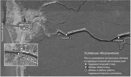 Обловы участка р. Промысловой в непосред-ственной близости работы гидроакустического комплекса позволили оценить видовой и размерный состав рыб, проходящих через сканируемое эхолотом сечение данного водотока, а результаты сетных съемок, проведенных на ее расширении и в Грибовом пруду, которые являются основными местами нереста весенне-нерестующих рыб, позволили сопоставить видовую структуру различных участков реки в целом и нерестилищ в частности. Схема расположения гидроакустического створа и мест проведения обловов на р. Промысловой представлены на рис. 1.