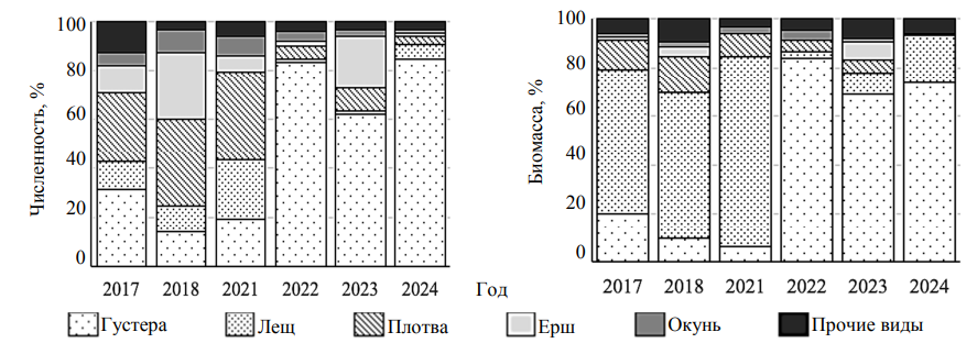 Контрольные обловы разноячейными сетями за рассматриваемый период наблюдений (2017, 2018, 2021–2024 гг.) позволили оценить динамику видовой структуры ихтиоценоза р. Промысловой. В ходе шестилетнего мониторинга было идентифицировано 23 вида рыб, при этом анализ собранной информации выявил выраженную трансформацию сообщества, что позволило разделить изучаемый период на две фазы: с 2017 по 2021 г. и с 2022 по 2024 г. Первая фаза (2017–2021 гг.) характеризовалась доминированием густеры, леща и плотвы, совокупная доля которых по численности превышала 70 %. В 2018 г. было отмечено увеличение доли ерша до 27 % от общего количества особей. По биомассе в указанный период преобладал лещ (более 59 % от совокупного показателя). Вторым и третьим видами по биомассе были густера и плотва, причем доля густеры постепенно снижалась, и к 2021 г. биомасса плотвы почти в 1,5 раза стала выше биомассы густеры. Во второй фазе (2022–2024 гг.) произошли изменения в видовой структуре рыбного сообщества р. Промысловой: доминирующим видом стала густера, составив в среднем более 76 % по численности и более 75 % по биомассе.