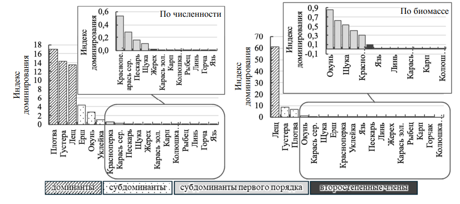 С целью более детального анализа вклада каждого вида в состав рыбного сообщества р. Промысловой в выделенные две фазы (2017–2021 и 2022–2024 гг.) был рассчитан индекс Палия – Ковнацки [9]. В 2017–2021 гг. согласно данному индексу доминирующими по численности видами являлись плотва, густера и лещ, субдоминантами – ерш, окунь и уклейка; по биомассе доминирующим видом был лещ, субдоминантными – густера и плотва (рис. 3).