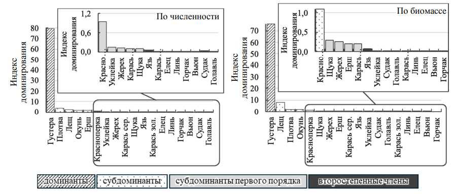 Во второй фазе единственным доминантным и по численности, и по биомассе видом стала густера. Лещ и плотва перешли в группу субдоминантных по численности видов, сюда же добавился и ерш. По биомассе в данную группу, помимо леща и плотвы, также вошли окунь и красноперка (рис. 4).