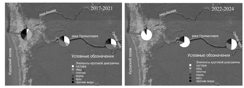 Проведенное исследование выявило значительные изменения в структуре ихтиоценоза р. Промысловой. На основе шестилетнего мониторинга (2017–2024 гг.) установлено, что в 2017–2021 гг. доминирующими видами по биомассе были лещ, густера и плотва, однако к 2022–2024 гг. густера стала абсолютным доминантом. Это подтвержда-ется расчетами индекса Палия – Ковнацки, кото-рый отразил переход густеры в категорию един-ственного доминирующего вида во второй фазе исследований. Вероятнее всего, наблюдаемые изменения связаны с формированием отмели в устье реки, которая ограничила миграцию леща, освободив экологическую нишу для густеры. Анализ гидроакустических данных показал, что нерестовый ход густеры растянут во времени (апрель–июнь) и не коррелирует с температурными условиями, что указывает на влияние иных факторов среды, требующих дальнейшего изучения (например, гидрологического режима или биотических взаимодействий). Высокая согласованность данных сетных обловов и гидроакустики (коэффициент корреляции Пирсона ≥0,91) подтверждает надежность примененных методов для оценки численности густеры и структуры ихтиоценоза в целом. Полученные данные могут играть важную роль при разработке мер по сохранению биоразнообразия бассейна Куршского залива, включая регулирование мелиорации и восстановление миграционных путей для леща. Дальнейшие исследования должны быть направлены на долгосрочный мониторинг восстановления экосистемы после антропо-генных вмешательств и анализ влияния климати-ческих факторов на динамику нерестовых мигра-ций. Работа вносит вклад в понимание механизмов перестройки рыбных сообществ, что необходимо для устойчивого управления водными ресурсами Балтийского региона.