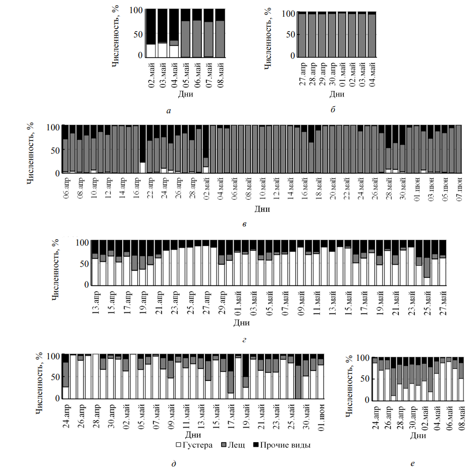 Данные гидроакустических исследований позволили по силе цели отраженного сигнала и уравнению для бокового ракурса восстановить размерный состав мигрирующих рыб. Сопоставление последнего с размерно-видовой структурой уловов ставных сетей дало возможность распределить количественные оценки результатов обработки эхограмм по видам рыб и сопоставить интенсивность захода с конкретными видами, в частности с лещом и густерой. В первой фазе в структуре нерестового хода преобладал лещ, а его заход в реку был растянут во времени. Выраженный ход густеры при этом практически отсутствовал: ее мигра-ционная активность приходилась на вторую часть апреля – начало мая и на последнюю декаду мая. Во второй фазе, начиная с 2022 г., в видовой структуре нерестового стада преобладала густера, ее ход был значительно растянут во временном аспекте: начиная с середины апреля вплоть до начала июня. Лишь в 2024 г. можно выделить период с 27 апреля по 3 мая, когда в видовой структуре нерестовой миграции преобладал лещ (рис. 7).