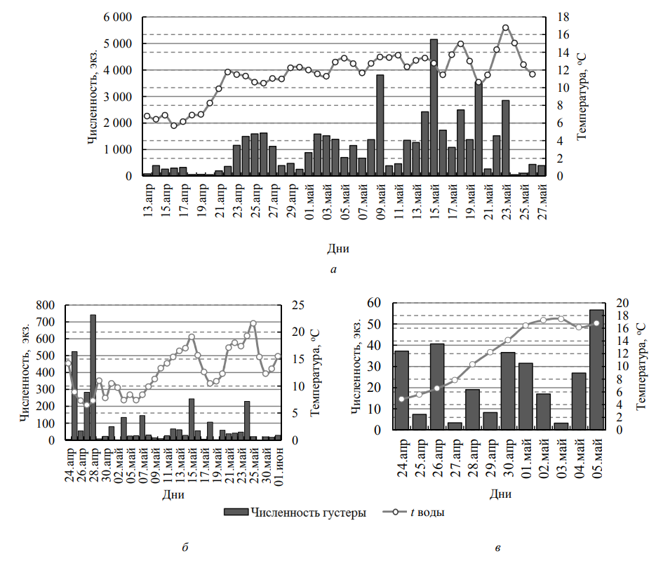 Известно, что на нерестовые миграции рыб влияют абиотические и биотические факторы среды. Среди абиотических факторов выделяют такие, как температура воды, сила и направление ветра, солнечная активность, уровень воды [1]. Сопоставление результатов мониторинга температуры и интенсивности хода густеры как доминантного представителя рыбного сообщества р. Промысловой во второй фазе наблюдений позволяют с уверенностью сказать, что температура воды являлась скорее второ-степенным показателем и не оказывала существенного влияния на заход данного вида в р. Промысловую (рис. 8), а активность нерестовой миграции определялась другими факторами, требующими дальнейшего изучения.