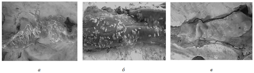 В некоторых случаях патогенное воздействие гельминтов проявлялось в сужении просвета кишечника вплоть до полной непроходимости. Подобная картина была характерна для каждого проявления цестодоза у леща, сазана, сома и щуки на протяжении всего периода исследований.