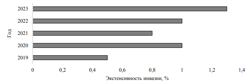 Частота встречаемости щуки, пораженной рафидаскаридозом в 2019–2023 гг. периодически изменялась, но не превышала ошибки среднемноголетнего показателя (1,07 ± 0,19 %), интенсивность составляла 8–38 экз. Наибольший уровень болезни выявлен в 2023 г., вероятно, это обусловлено ранним паводком и увеличением температуры воды в данный период, что благотворно сказалось на развитии нематод (рис. 2).