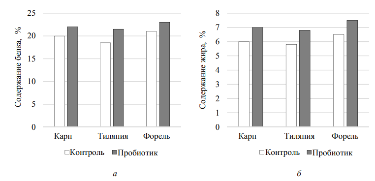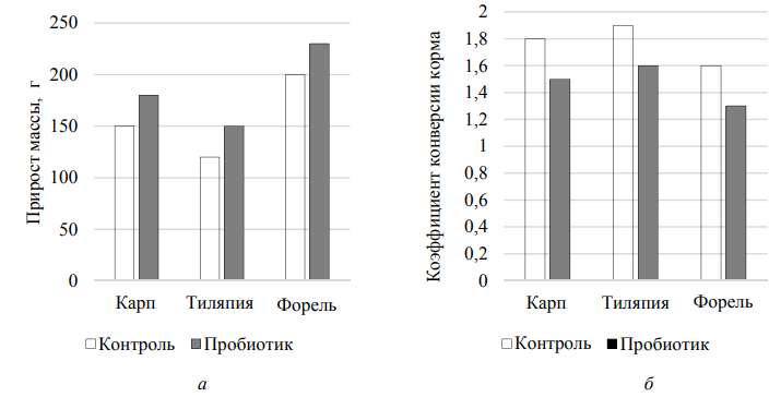 Детальный анализ табл. 7 выявляет тенденцию к улучшению всех показателей у всех видов при использовании пробиотика. У карпа наблюдается наилучшая реакция с точки зрения ускорения роста, зафиксированы наибольшее относительное увеличение удельной скорости роста (+21,3 %) и наилучшее улучшение коэффициента конверсии корма (–17,1 %). С другой стороны, форель продемонстрировала наивысшую реакцию в части улучшения состояния здоровья, показав наибольшее увеличение выживаемости (+7,2 %). Тиляпия показала сбалансированный ответ по всем показателям. Эти различия могут быть связаны с особенностями пищеварительной системы и физиологии каждого вида (рис. 6).